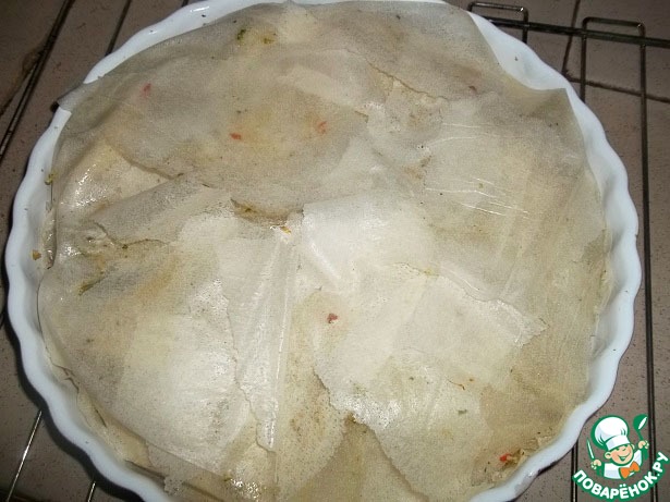 Затем распределить 4 листа теста в нахлест по окружности и чтобы края свисали примерно наполовину, так как ими мы закроем начинку. Так же смазать маслом по дну и бокам. Важно! - работать с тестом фило нужно быстро, иначе оно подсыхает. Распределить начинку.