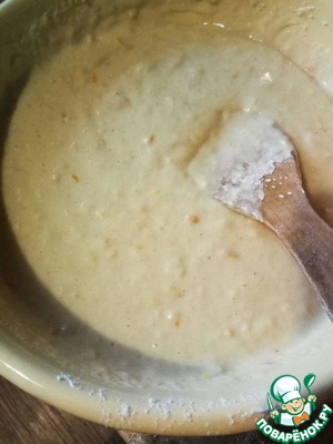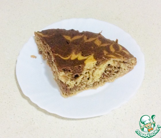 Манку залить сывороткой и оставить набухать в течение часа. яйца взбить с сахаром, добавить в манку. положить соду, перемешать и дать постоять минут 5, чтобы сода погасилась. положить сметану и муку, цедру- вымесить эластичное жидкое тесто. тесто разделить на две части-одна светлая, во вторую добавить какао.