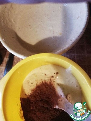 Вымесить эластичное жидкое тесто. тесто разделить на две части-одна светлая, во вторую добавить какао.
