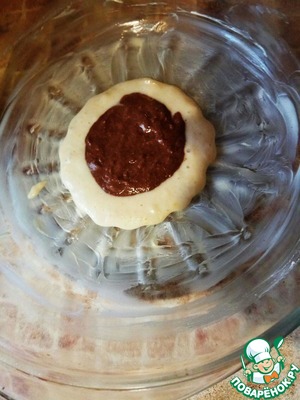 Выкладывать тесто по одной ложке на центр формы, чередуя темное и светлое тесто. каждую следующую порцию теста кладем в центр предыдущей порции, и так пока не закончится тесто.