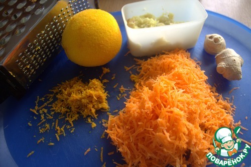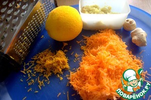 Натереть цедру апельсина (не затрагивая белую мякоть), морковь, имбирь. Имбирь натираю сразу в небольшую ёмкость, держу в холодильнике и добавляю в чай.