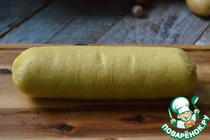 Помогая себе пленкой, свернуть картофельное тесто в рулет, начиная с узкого края.