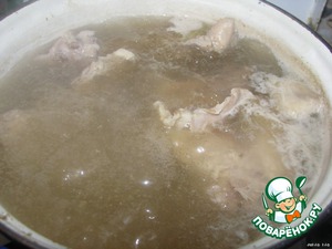 Сварить бульон из курицы и шампиньонов. Курицу и грибы я потом использовала для салата "Ананасовая корзинка": http://www.povarenok .ru/recipes/show/168 50/ Бульон посолить и поперчить по вкусу.