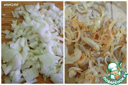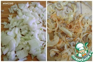 Лук нарезать мелко и пожарить, на половине растительного масла, до золотистого цвета.