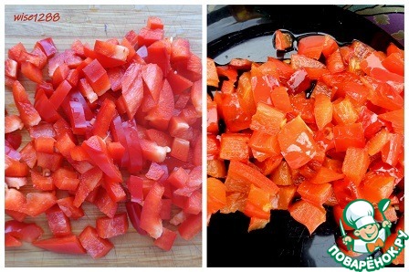 Перец нарезать кубиками и пожарить, на оставшемся растительном масле.