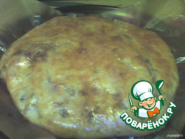 Стягиваем края, формуем круглый плоский закрытый пирог, переносим на лист или в форму швом вниз. Сверху смазываем взбитым желтком и отправляем в горячую духовку до зарумянивания.