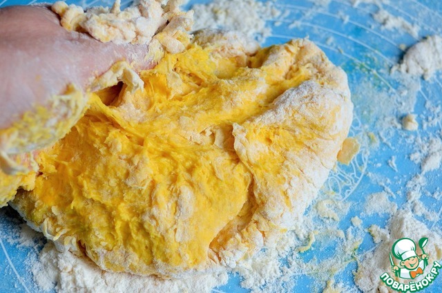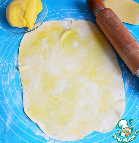 На подпылённом мукой рабочем месте раскатать 1/3 теста, как можно тоньше.