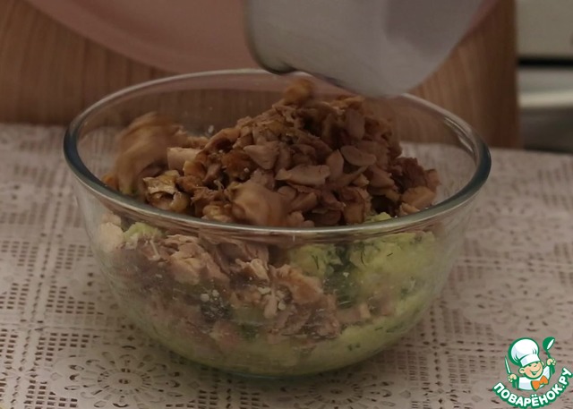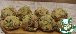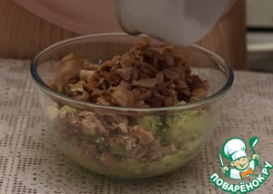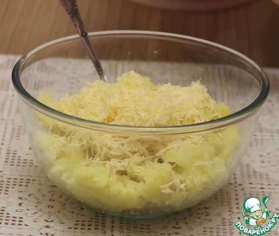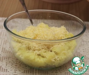 Добавляем к картофелю сыр, зелень, куриное мясо и все хорошо перемешиваем.