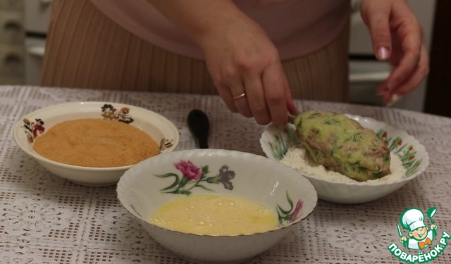 Панируем получившуюся голень сначала в муке, далее во взбитом яйце, затем в панировочных сухарях.