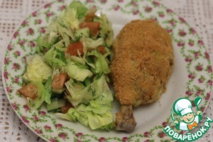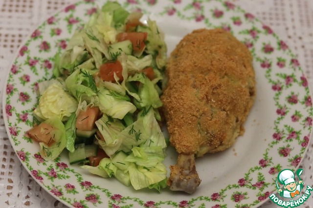Куриные голени фаршированные картофельным пюре в панировке готовы. Обычно я их подаю с легким салатом из овощей (огурец, помидор, листья салата). Уверена вашей семье это блюдо придется по вкусу. Особенно детям.