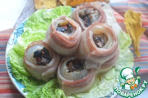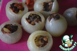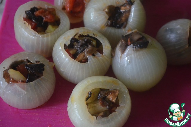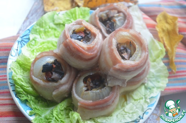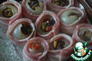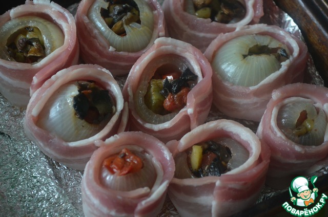 Очень вкусная закуска фаршированной лук овощами, обернутый беконом и запеченный в духовке. По желанию лучок можно сверху посыпать сыром, зеленью или полить майонезом.