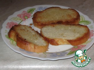 • Батон нарезать тонкими ломтиками, обжарить одну сторону.