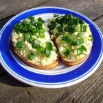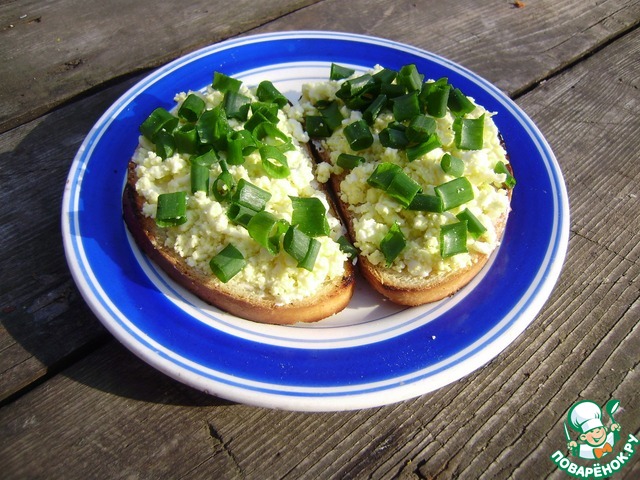 • Вареные яйца покрощить и посыпать гренки. Сверху притрусить зел. луком.
