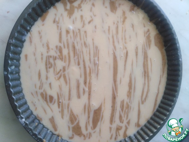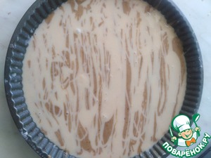 Форму смазать сливочным маслом и выложить тесто поочерёдно полосками.