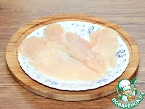 1. Куриную грудку нарезаем пластинами. Разрезать мясо удобнее, когда оно немного подмороженное. Если не получились пластины при нарезке, сформировать прямоугольник можно из обрезков, главное, чтобы они были пластинчатые в разрезе.