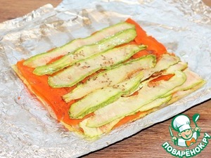 6. Кладем пластины кабачка на морковь, посыпаем приправой для овощей, перцем и солью.