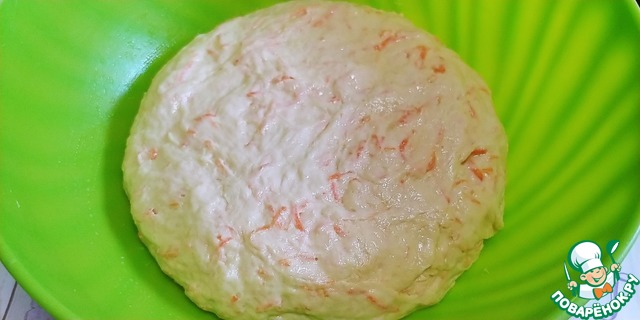Тут все просто.10 гр дрожжей растираем с сахаром, через минуту у нас будет масса серого цвета. Далее добавляем все по списку-олив. масло, теплое молоко с водой, мелко натертую морковь и муку. Последнюю добавляем постепенно, сначала один стакан, вымешиваем, затем второй, затем еще немного. Работаем ложкой, ручки не пачкаем. Когда вымешивать становится тяжело, выкладываем тесто на рабочий стол и домешиваем руками, до собирания его в шар. Мукой не забиваем.