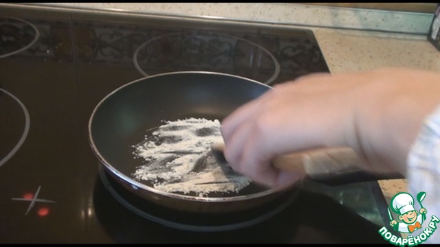 Сначала приготовим карамель. Для этого 1 ч л муки обжарим на сухой сковороде до золотистого цвета. Не пережарьте, а то мука будет горчить!