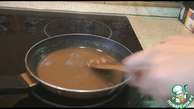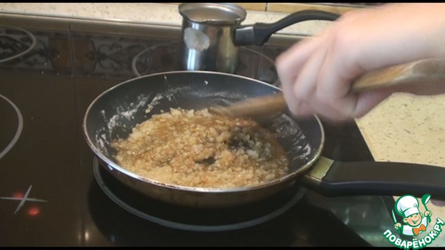Когда мука поджарится, добавляем сахар и щепотку соли. Прогреем две минуты и добавим 20 гр сливочного масла, размешаем и ждем, чтобы сахар расплавился.