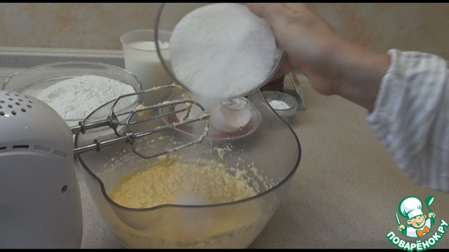 Добавляем сахар, щепотку соли и ванильный сахар. Взобьем миксером.