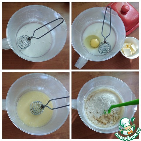Делаем тесто. Я буду делать из бифидока. Можно взять кефир или кислое молоко. Добавляем сахар и разрыхлитель. Венчиком соединяем и ждём реакции. Разбиваем яйцо. Масло сливочное растапливаем. Я это сделаю в СВЧ 55 секунд при мощности 800. Отправляем в смесь. Опять все соединяем. Добавляем муку понемногу и лопаточкой собираем. Когда масса возьмёт достаточно муки, работаем руками.