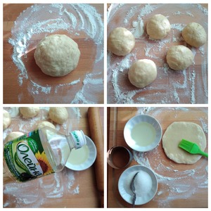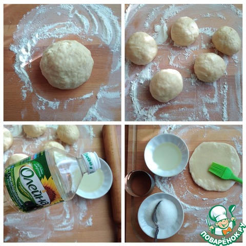 Тесто немного к рукам липнет. Его не нужно забивать мукой. Я смазала руки подсолнечным маслом. Скатываем тесто в шар, накрываем полотенцем и даём ему немного постоять - 10-15 минут. Делим тесто на 5 частей и скатываем в шарики, величиной чуть больше куриного яйца. Готовим масло подсолнечное, сахар и корицу. Раскатываем каждый шарик в круг, толщиной ~1 см и D~12 см. Смазываем маслом подсолнечным верх, используя кисточку.