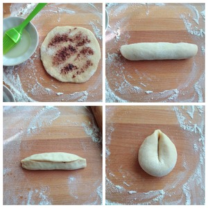 Присыпаем сахаром, в расчёте 1 ч л на 1 круг, корицей - 0.5 ч л на 1 круг. Корицей и сахаром присыпайте по вкусу. Скручиваем рулетик, прищипываем край, соединяем концы (см. фото).