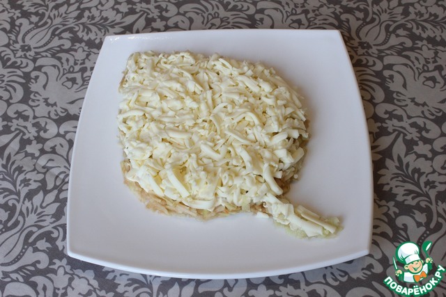 Плавленые сырки натираю на крупной тёрке. Аккуратно распределяю сырки вторым слоем салата. Смазываю слой майонезом.
