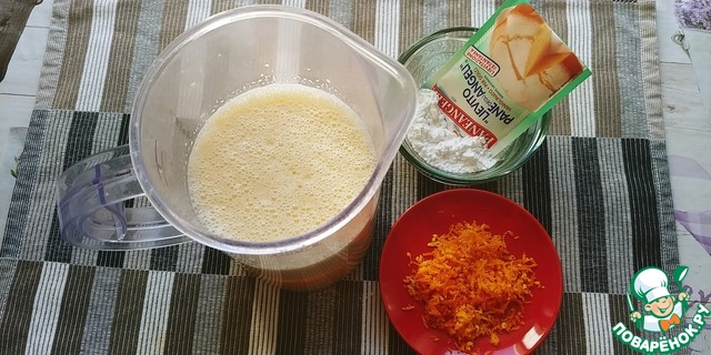 Разрыхлитель смешиваем с крахмалом, вводим в смесь также цедру 1 апельсина.