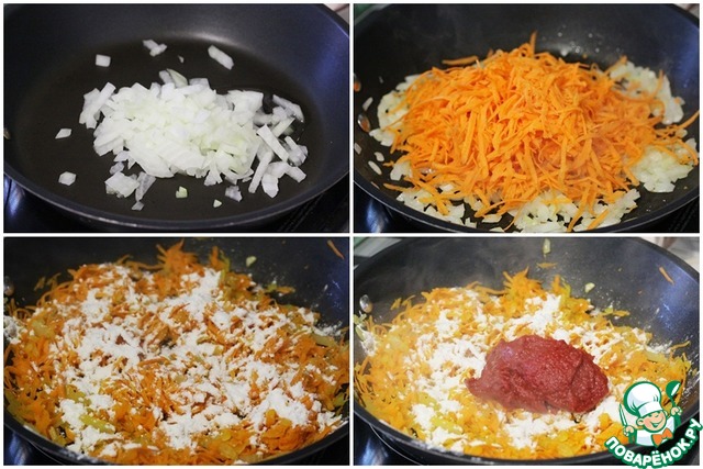 Тщательно все перемешать и влить 150 мл воды. Тушить на слабом огне 3-4 минуты, до готовности лука и моркови. При необходимости можно добавить еще немного воды.