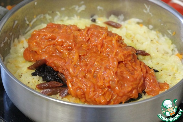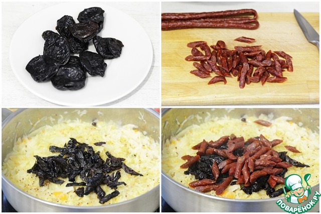 По истечении 30 минут добавить чернослив и колбаски к капусте. -