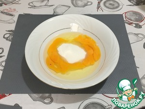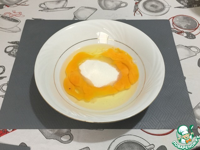 Вбиваем яйца. Далее добавляем сахар, 5 г разрыхлителя и перемешиваем. Сахар должен полностью раствориться.