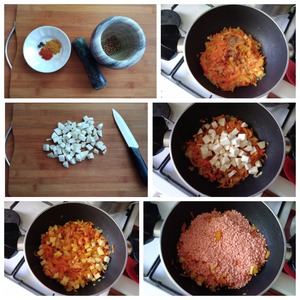 Готовим специи. Карри и перец кайен. Если нет кайена, то можно порезать по вкусу свежий острый перец. Кориандр у меня был в зёрнах. Я его разбила в ступке. Выкладываем в сотейник специи, перемешиваем. Кладём репу (картофель) порезанную кубиком, ещё томим минуты 3. Репу заменяем картофелем в том случае, если у вас нет репы в наличии в данный момент, а супа захотелось! Теперь очередь чечевицы. У меня дробленная красная чечевица. Она готовится очень быстро. Чечевицу можно использовать любую. Даём чечевице пропитаться всеми пряными овощными соками.