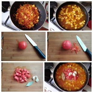 Заливаем горячим процеженным бульоном. Доводим до кипения и варим всё до готовности чечевицы. Мне понадобилось 20 минут. В самом конце приготовления супа нам понадобится помидор и целые дольки чеснока, лавровый лист. С помидора нужно снять кожицу. Надсекаем помидор крест на крест, помещаем на шумовку и отправляем в кипяток на 1 минутку, затем легко с него снимаем кожицу. Режем помидор небольшим кубиком. Выкладываем в суп помидор, чеснок и лавровый лист. Варим 3 минуты и снимаем суп с огня.