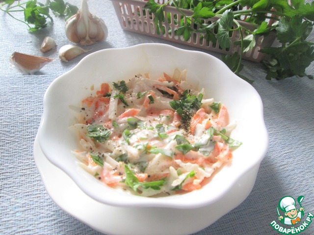 Морковь, дайкон натёрла на крупной терке (дайкон у меня огромных размеров потому написано 0,5 штуки - в общей команде их соотношение с морковью получилось 1 к 1-му. Добавила измельчённые чеснок и ароматную петрушечку (своя, дачная перед морозами собранная