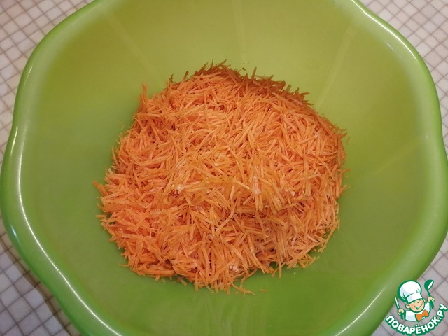 Морковь натереть на тёрке для корейской моркови.