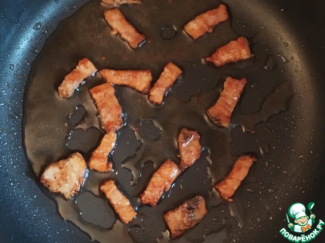 Нарезать сало полосками и обжарить его до коричневого хрустящего состояния.