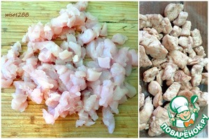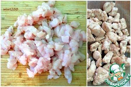 Куриное филе нарезать на маленькие кусочки, посолить (0.2 чайной ложки соли использовать) и пожарить на 0,5 столовой ложки растительного масла до готовности.