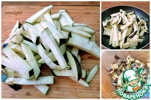 Баклажан нарезать соломкой, посолить (0.2 чайной ложки соли использовать) и пожарить на оставшемся растительном масле до готовности.