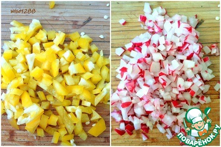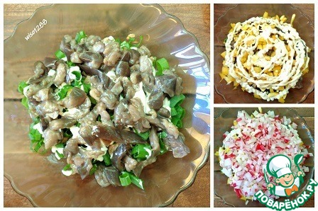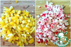 Следующий слой – баклажаны, затем сладкий перец и майонез. Завершить слоем из редиса. Посолить оставшейся солью.
