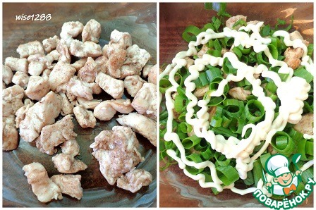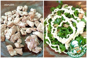 Собрать салат: первый слой – курица, затем зеленый лук и майонез.