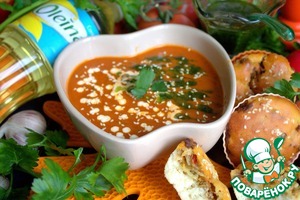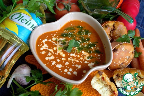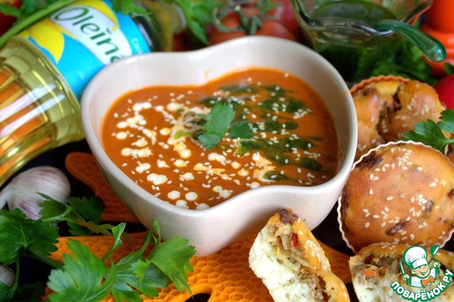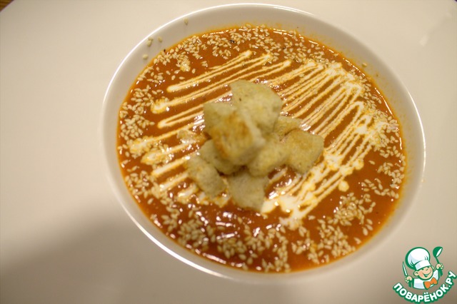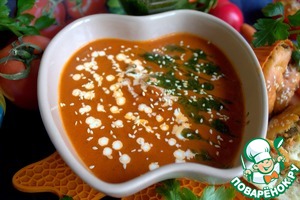 Пикантный, богатый специями, супчик понравится даже мужчинам, не любителям супов-пюре. Подаём либо, полив сливками (сметаной), с чесночными сухариками или сырными чипсами. Наш эксперимент: песто из петрушки-тоже вариант для подачи. Сливки по желанию можно смешать после взбивания супа, если уверены, что сразу съедите. Без сливок томатный суп хранится в холодильнике до 3-х дней.