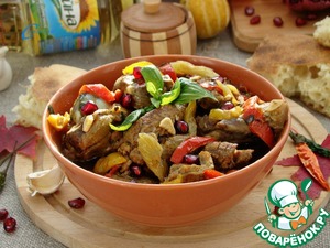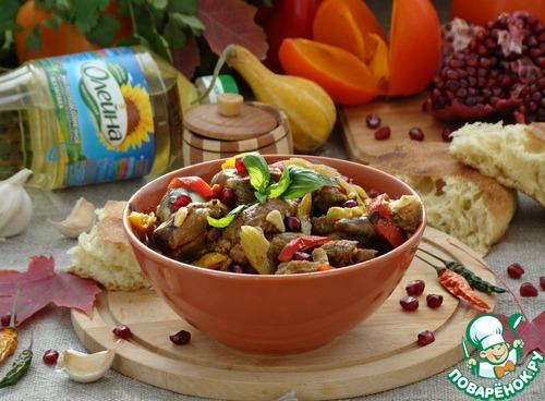 Обжаренные овощи переложить в сотейник, добавить соль, уцхо - сунели, хмели - сунели и молотый черный перец. Все перемешать, довести до кипения, убавив огонь, тушить минут 15-20.