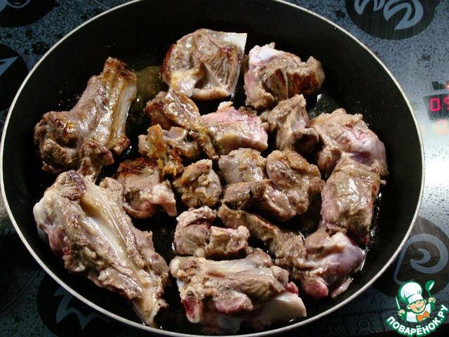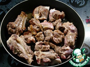 Обжарить баранину со всех сторон, до румяной корочки и переложить в сотейник или казан.