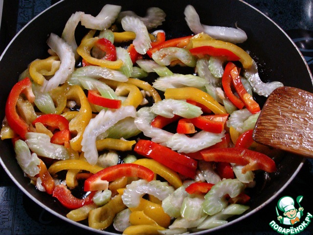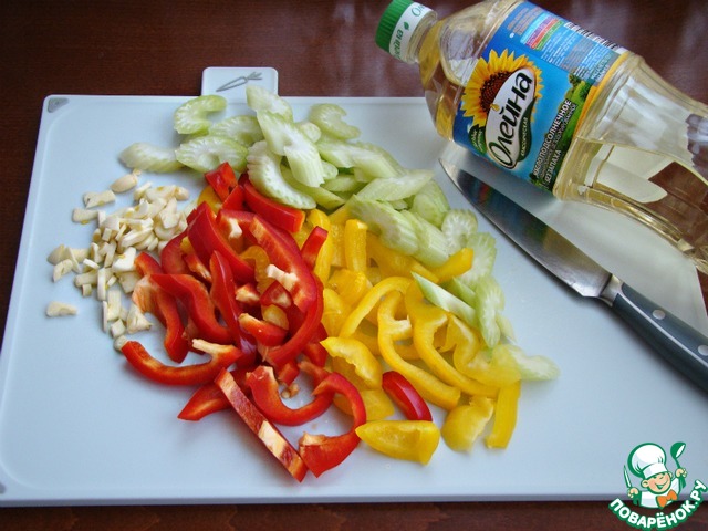 Пока тушится мясо, подготовить овощи : болгарский перец и сельдерей нашинковать крупной соломкой. Чеснок нашинковать слайсами.