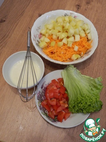 Картофель запечем заранее, порежем как и яблоки, помидоры кубиками. Листья салата порвем руками. Можно еще добавить зелени петрушки по желанию.