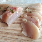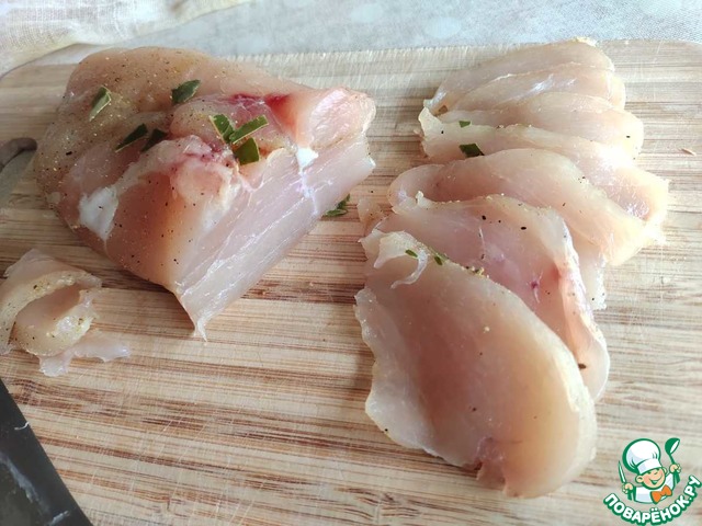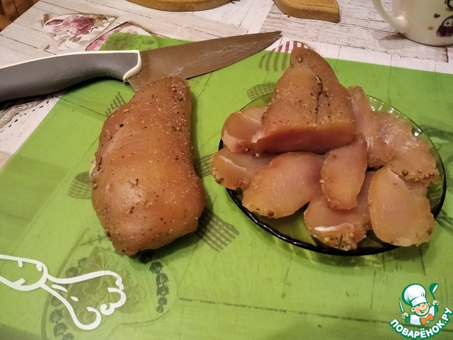 Всю соль хорошо смыть холодной водой (грудка станет жесткой, так и должно быть), обсушить бумажным полотенцем.