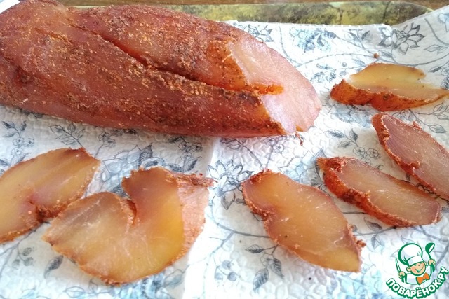 Скрутить рулетиками, завернуть в марлю 2-3 слоя и положить вялится в холодильник на 7-10 дней (в зависимости от размера кусочка) или подвесить под кухонной вытяжкой на 6-7 дней.
