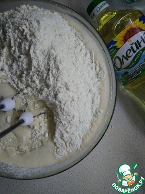 Муку перемешать с содой и добавить к общей массе. Перемешать.