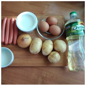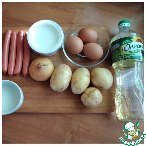 Нужно позолотить лук, порезав его полу-кольцами, в подсолнечном масле. Сосиски нарезаем произвольно (см. фото).